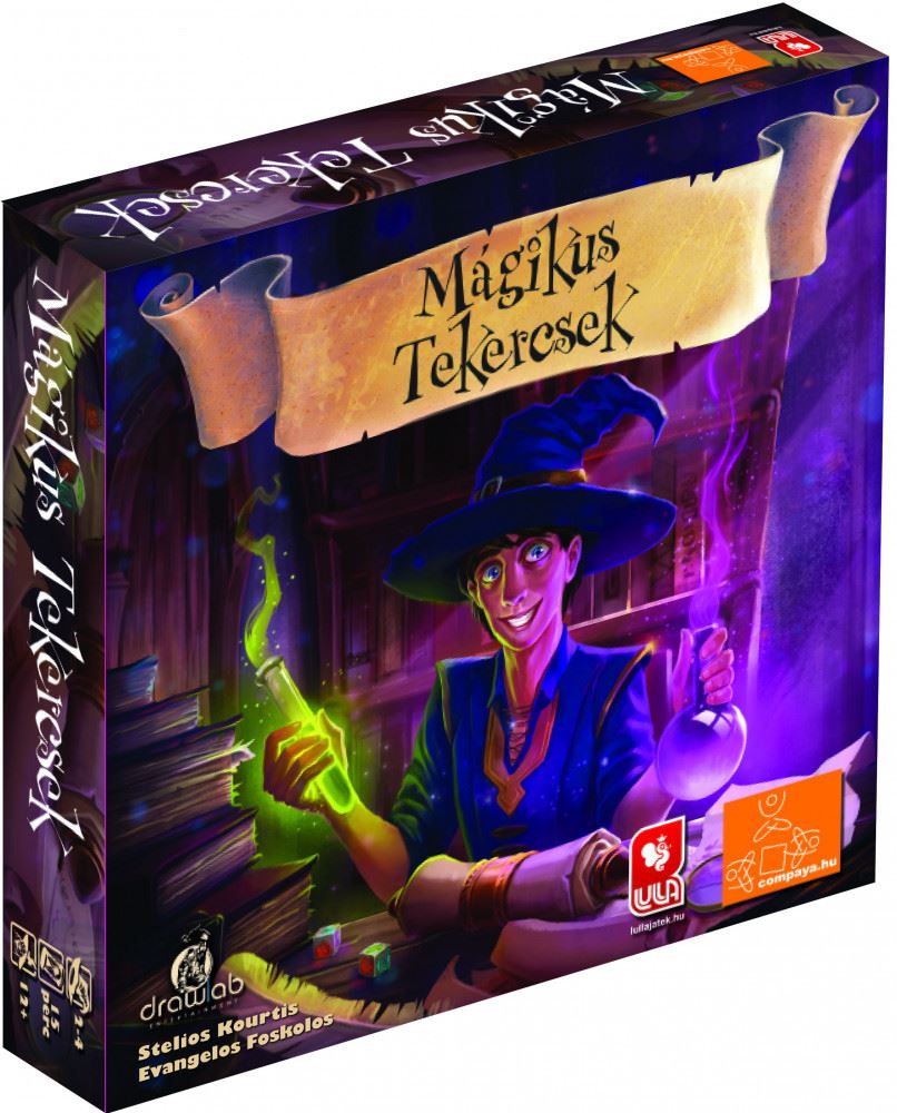 Tulajdonságok:A Mágikus tekercsek egy valós idejű kockajáték, ahol minden játékos egy varázsló bőrébe bújik. A játék során varázsigéket kell kijátszani, hogy megszerezzük a rejtett tekercsek nyújtotta titkos tudást. A körökben a játékosok kockával dobnak addig, amíg ki nem dobják az aktuális tekercs, vagy a saját varázsigéjük motívumait. Amikor ez sikerült, a kockákat a lapra helyezik és újabbakat húznak helyettük. A kör akkor ér véget, ha nincs több kocka, vagy valaki kidobta a tekercs motívumait. Ekkor végrehajthatók a varázsigék, amiket védekezni és támadni is lehet. Tartalma: 44 egyedi kocka, 4 játékostábla, 42 nagyméretű kártya Nyelv: Magyar Kor: 12+ Játékosok száma: 2–4 fő Szerző: Stelios Kourtis, Evangelos Foskolos