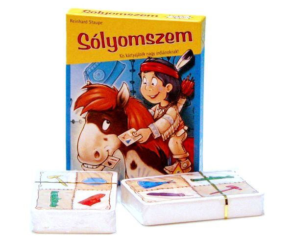 Tulajdonságok:Kis kártyajáték nagy indiánoknak! Az indiánok látása kiváló, vajon a tiéd is az? Figyeld meg „sasszemmel” a lapokat mint egy indián és légy te a leggyorsabb! Az a játékos nyer, aki elsőként megtalálja a felfordított lapok helyét! Minden kártyán 4 különböző tárgy van, 4 eltérő színben. A játékban a lapokat kell egymás mellé illeszteni úgy, hogy az egymás mellé illesztett lapokon a 4 egymással határos szimbólum képe és színe különböző legyen!